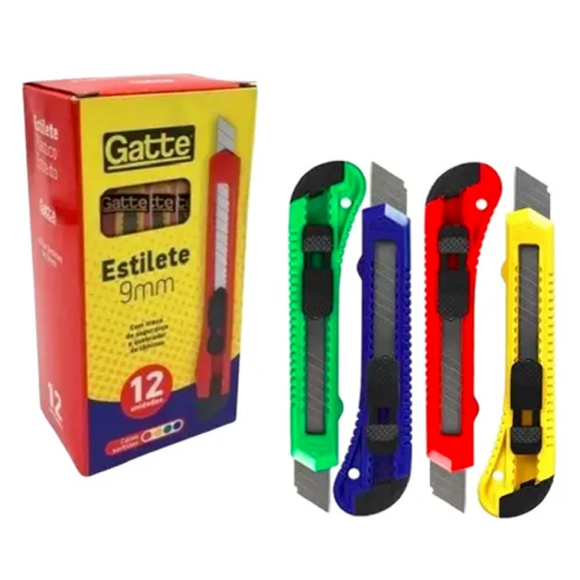 Comprimento: 125mm / Lâmina: 09mm / Com trava de segurança / Caixa com 12 estiletes / Cores sortidas sendo: Azul, Verde, Laranja e Amarelo