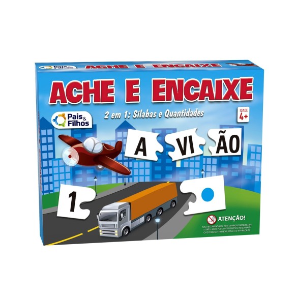 Embalagem contém 2 (dois) tipos de Ache e Encaixe: - Ache e Encaixe (Palavras): Onde cada figura (desenho) se encaixa com a palavra correspondente, que está dividida em sílabas (8 fichas com 4 peças cada) e Ache e Encaixe (Números): As combinações para o encaixe estão divididas em três partes: número, figuras e bolinhas ( 10 fichas com números e figuras com 3 peças cada. / Idade: + 4 Anos / Participantes: 1 ou Mais Jogadores / Registro Inmetro: 003934/2019, OCP0046.