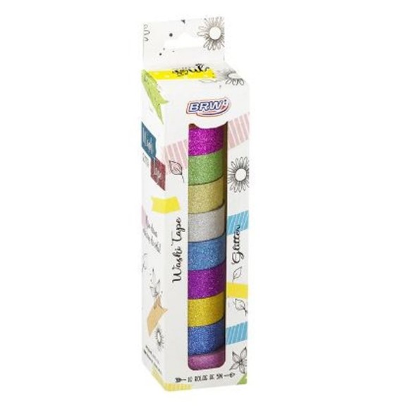 As Fitas Washi Tapes Glitter BRW são adesivos suaves que proporcionam a colagem em diversas superfícies lisas, tal como em cadernos, madeiras, vidros e paredes / Os variados tons e estampas disponíveis permitem fazer sobreposições que podem ser usadas para organizar os estudos, decorar itens e colar em scrapbooks / Embalagem com 10 rolos de fita medindo 15mm x 5m / Cores: Azul Escuro, Verde, Dourado, Amarelo, Azul Claro, Laranja, Roxo, Rosa, Lilás, Prata.