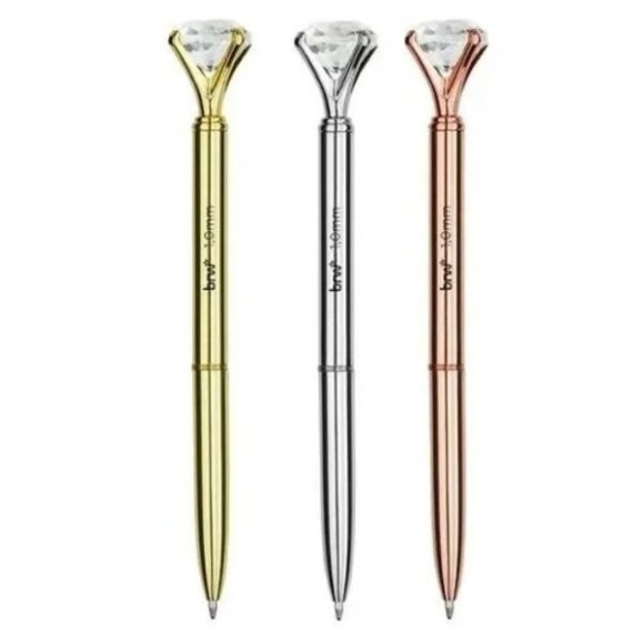 Detalhes: Caneta esferográfica Diamond / Ponta média 1.0mm / Disponível em 3 cores: Prata, Dourada e Rose Gold / Cor da tinta: Azul / Produto sem necessidade de certificação conforme portaria Nº 481/2010.