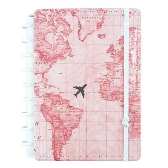 O Médio é exatamente o que seu nome promete: um intermediário entre o A5 e o universitário. Com ele, você pode escrever muito sem sentir tanto o peso a mais de carregar um caderno maior. Cabe bem nas bolsas maiorzinhas, então é perfeito para aqueles estudantes que preferem não sair de mochila todos os dias ou precisam levar muitos livros ou apostilas para lá e para cá. Também é excelente para reuniões de trabalho! Feito especialmente para quem ama viajar e quer se lembrar de todos os lugares incríveis que já visitou, o CI Mapa Mundi Rosa, feito em parceria com a Gocase, é uma edição exclusiva com capa e contra capa super fofa em couro ecológico, completando seu mundo cor-de-rosa com um brilho super sofisticado.