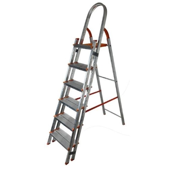 Estrutura reforçada 100% em alumínio / Patamar em polipropileno com degrau anexo / DEGRAUS DUPLOS antiderrapantes / Corrimão de apoio duplo / Fita de segurança / Produto indicado para até 150 Kg / 5 Degraus / Altura aberta: 154cm / Altura patamar: 107cm / Altura fechada: 166cm.