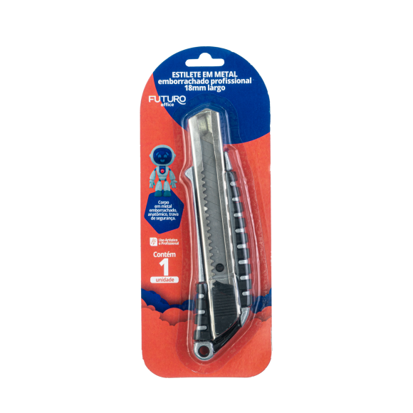 Estilete em metal largo 18mm / Possui corpo em metal emborrachado anatômico, com trava de segurança / Composição: Corpo em metal, cabo emborrachado, lâmina em aço.