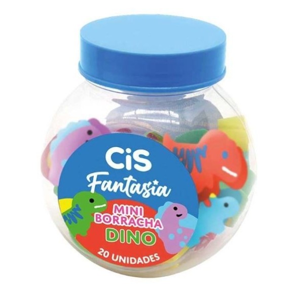 Detalhes: Pote com 20 mini borrachas / Formatos: Dinossauros / Tamanho aproximado das mini borrachas: 1,7cm x 1,5cm / Produto Certificado INMETRO (Artigo Escolar/Segurança) – Registro 003521/2013
