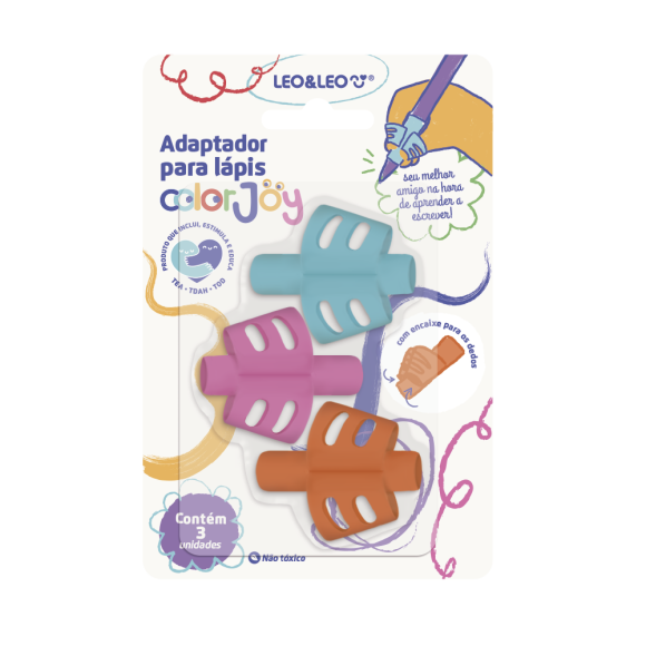 O Adaptador de Lápis com Encaixe no Dedo Color Joy Leo e Leo veio para resolver o problema que algumas crianças enfrentam para segurar a caneta ou o lápis. As 3 alças facilitam o controle do lápis, promovendo o encaixe e a postura correta dos dedos, além de evitar que o polegar e o indicador se cruzem. Isso faz com que erros sejam evitados, pois corrige as habilidades de escrita das crianças. O design ergonômico do adaptador colabora para pegada correta, principalmente na coordenação motora fina (pinça). Feito de silicone de alta qualidade, ele é atóxico, e será uma grande parceiro das crianças poder se desenvolver, escrever e desenhar de maneira livre e sem problemas no manuseio do lápis ou da caneta. O Adaptador de Lápis com Encaixe de Dedo Color Joy é inclusivo e confortável. Sua versatilidade ao acoplar lápis e canetas oferece flexibilidade aos educadores, terapeutas ocupacionais e pais, permitindo a escolha dos instrumentos mais adequados às necessidades específicas de cada criança na alfabetização. Este é um produto que inclui, estimula e educa, feito também para crianças atípicas com os transtornos TEA, TDAH e TOD. A Linha inclusiva Color Joy foi aprovada por mães, filhos e profissionais especialistas da área.