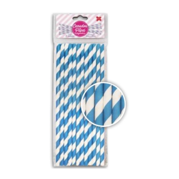 Canudo de papel biodegradável Listrado – Azul Claro / Medidas: 6mm x 200mm / Embalagem com 12 unidades.