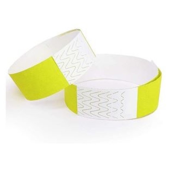 Pulseira confeccionada em tyvek / Possui lacre adesivo ajustável ao pulso / Resistente à água / Embalagem com 50 unidades / Cor: Amarelo