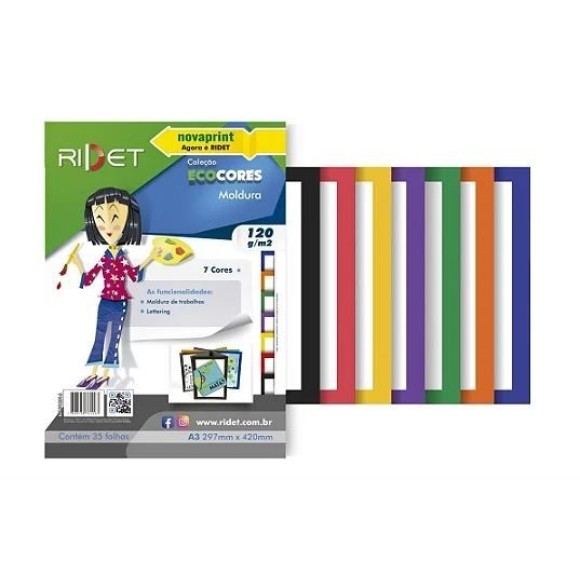 Especificação: Papel ecocores moldura / Formato: A3 / Medidas: 297mm x 420mm / Gramatura: 120g/m² / Embalagem com 35 folhas / Embalagem com 7 cores (5 folhas de cada cor).
