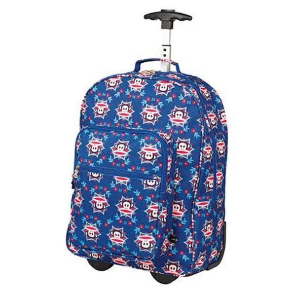 Mochila de rodinhas grande Paul Frank é produzida em poliéster / Possui carrinho de alumínio embutido / Alça de mão / Possui bolso principal e dois bolsos frontais com fechamento em zíper e puxadores personalizados com o rosto do personagem / Bolso lateral em redinha e elástico para guardar pequenos objetos ou garrafinha.