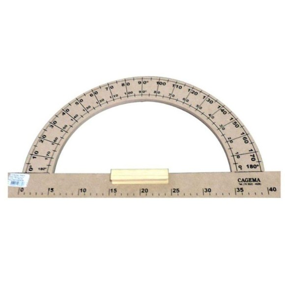 Transferidor de 180º com pegador facilitando a pegada / Indicado para quadros escolares. Comprimento: 45 cm / Material: madeira