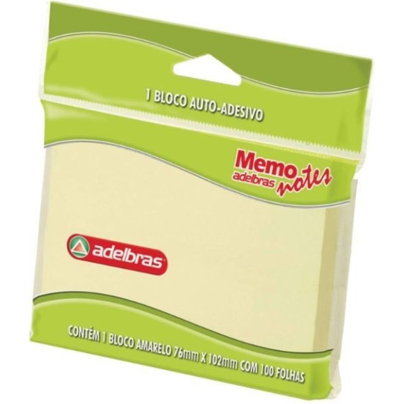 Detalhes: Bloco autoadesivo Adelbras Amarelo / Medidas: 76mm x 102mm / Embalagem contém: 1 bloco com 100 folhas