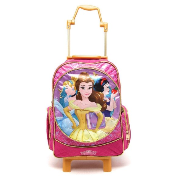 A mochilete princesas é produzida em poliéster / Carrinho em alumínio com puxador e alça de mão em polipropileno / Possui bolso principal, bolso frontal e dois bolsos pequenos laterais todos com fechamento em zíper e puxadores personalizados.