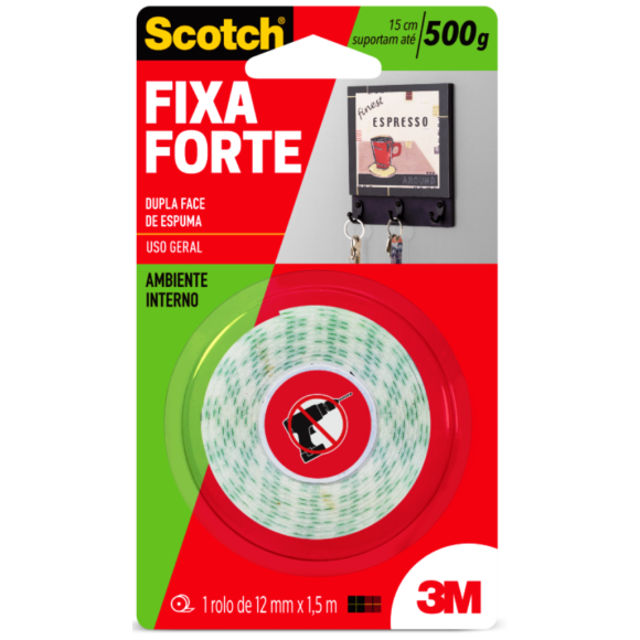 Uso em ambiente interno / Superfícies recomendadas: Madeira com verniz ou pintada, paredes internas, vidros, placas de metal, acrílico e azulejos (exceto banheiros) / Cada 15cm de fita suportam até 500g.