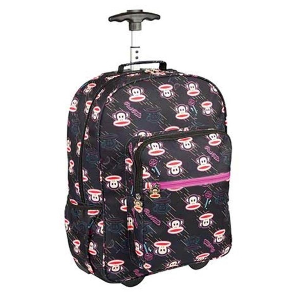 Mochila de rodinhas grande Paul Frank é produzida em poliéster / Possui carrinho de alumínio embutido / Alça de mão / Possui bolso principal e dois bolsos frontais com fechamento em zíper e puxadores personalizados com o rosto do personagem / Bolso lateral em redinha e elástico para guardar pequenos objetos ou garrafinha.